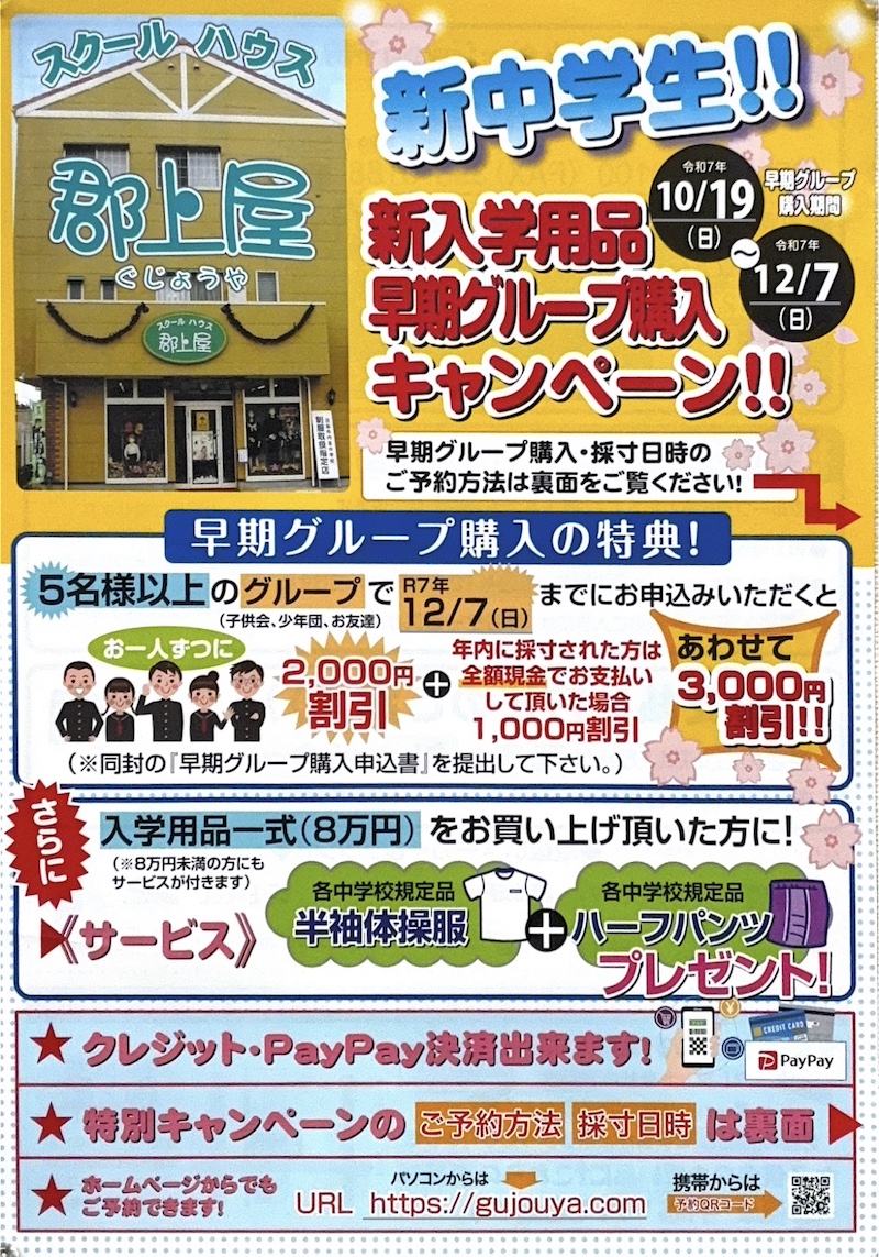 只今、2026年度の新中学生早期グループ購入予約を受け付けおります。
